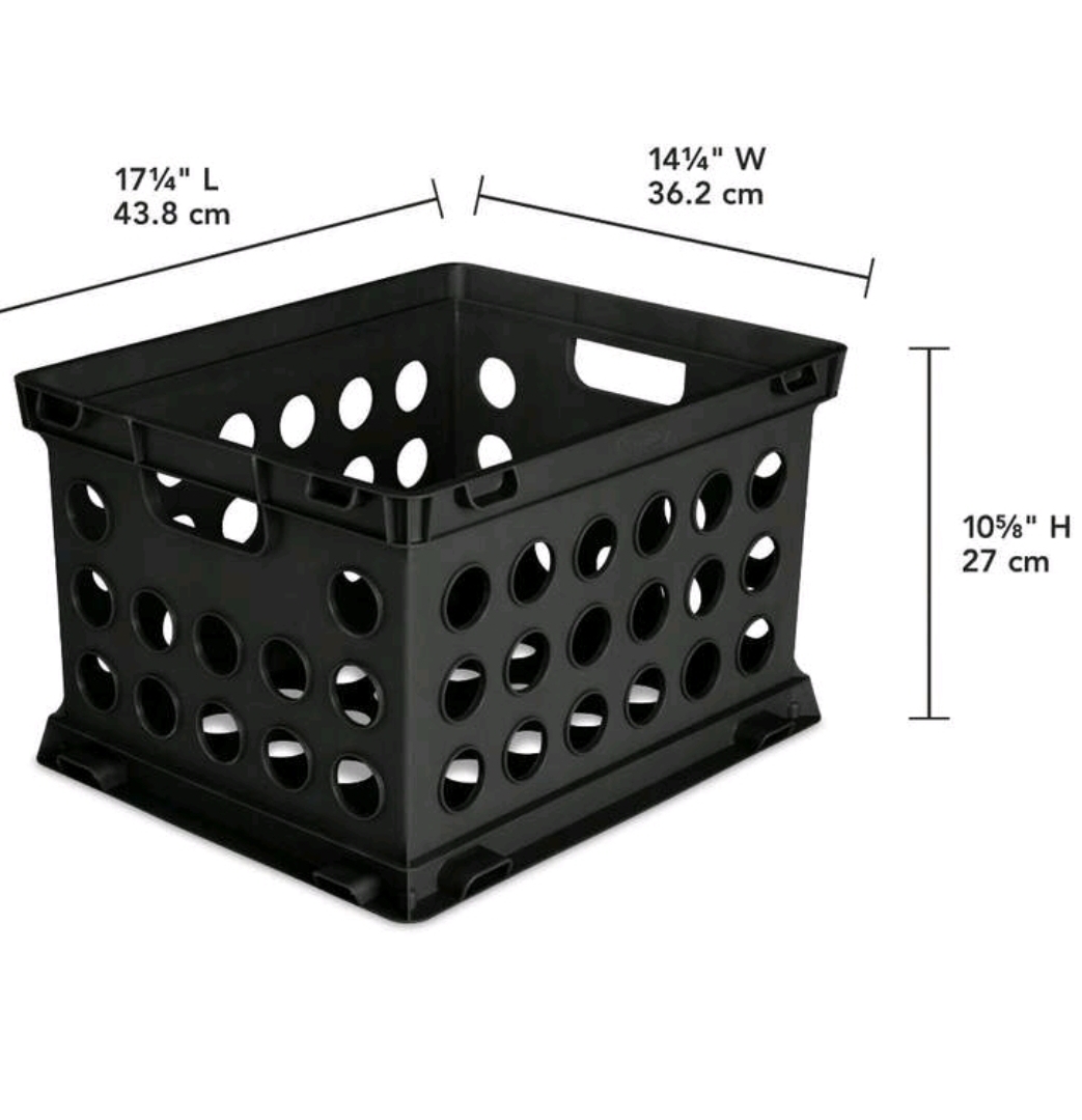 17 1/4" L x 14 1/4" W x 10 3/4" H. File Crate, Versatile Plastic Bin with Through Handles, Letter or Legal-sized File Storage, Stackable, BlackOutside Dimensions: 17 1/4" x 14 1/4" x 10 3/4"Interior Dimensions at bottom: 15" x 12" x 10 1/4"This versatile plastic File Crate can be used throughout the home, office, dorm, garage, and utility areas The ideal file tote organizer for keeping important paperwork sorted, neat, and containedConveniently accommodates either letter-size or legal-size file foldersUse multiple File Crates to create a customizable storage systemModular design provides the flexibility of vertical and horizontal stacking optionsGreat for sorting and displaying albums and books in entertainments areasIntegrated carry-through handles make this a portable storage solution and phthalate-free